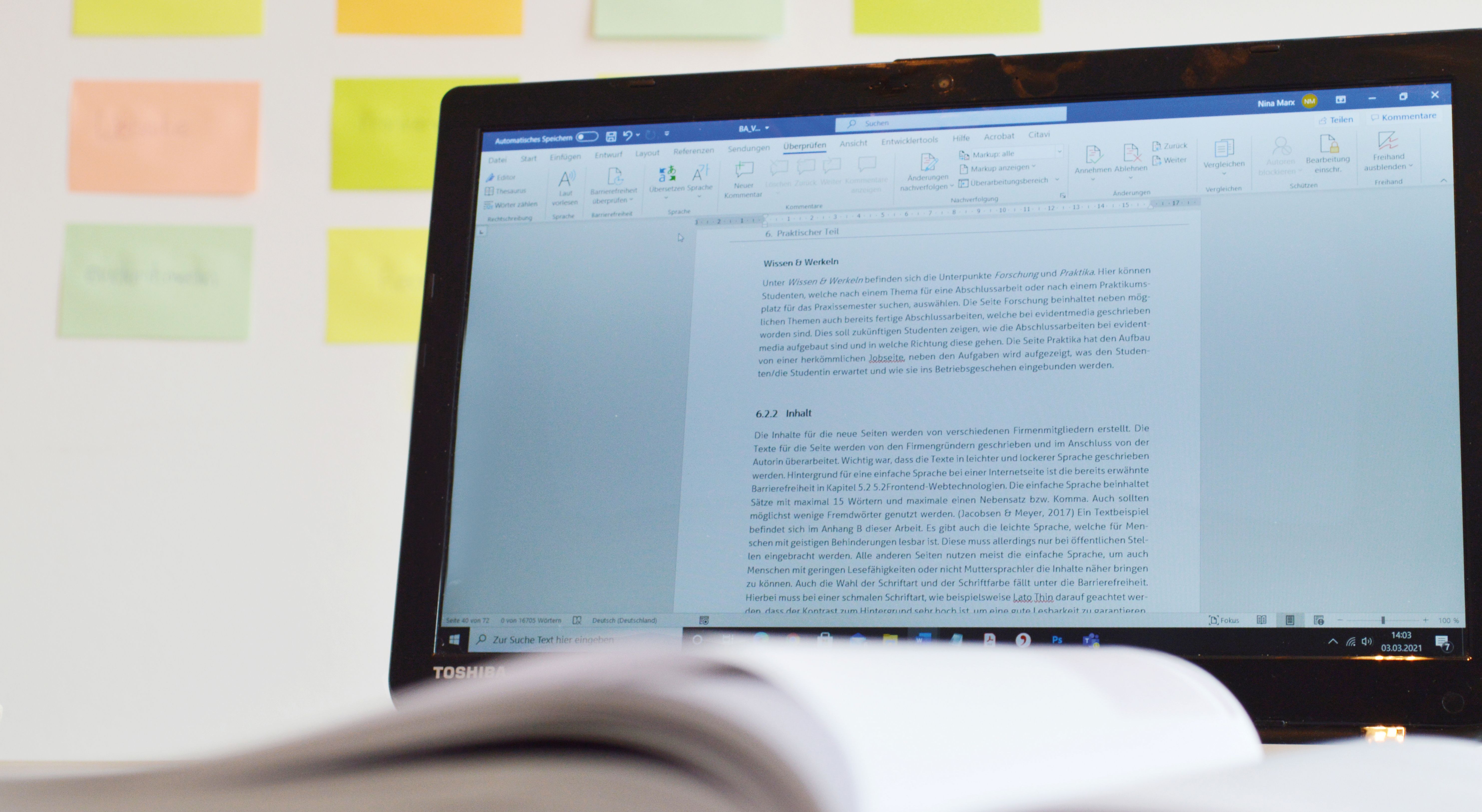 Du möchtest gerne deine Abschlussarbeit in einem Unternehmen praxisnah und am Puls der Zeit schreiben? Etwas bauen, produzieren, gestalten, was nicht in einem Bücherschrank verstaubt? Dann schreib doch deine Bachelor- oder Masterarbeit einfach bei evidentmedia. Du profitierst durch Unterstützung in Praxis und Theorie und auch in Sachen Planung, Konzeption, Ideenfindung. Und vor allem in Sachen sauberem wissenschaftlichen Arbeiten haben wir einiges drauf. Du kannst dich hier mal durch unseren Themenspeicher wühlen. Vielleicht ist schon was dabei, was dich begeistert. Falls du eigene Ideen hast, prüfe einfach mal, wie sich die anderen Themen darstellen und wo vielleicht Überschneidungen sind. Komme gerne noch mit deiner eigenen Idee auf uns zu.